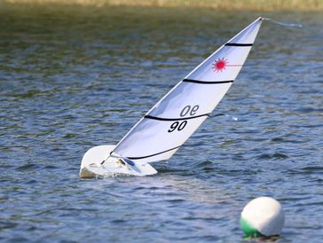 The RC Laser class is designed to replicate the performance and simplicity of the full-sized Laser dinghy, one of the world’s most popular one-design racing sailboats. The RC Laser was designed to be up and sailing out of the box in under 7 minutes. Unlike many RC sailboats that require complex rigging and tuning, the RC Laser is built for quick setup. , with an unstayed mast that slots into the deck and interchangeable sail rigs that adjust for varying wind conditions. It’s about 42 inches (1.06 m) long, lightweight, and highly durable, making it easy to transport and sail anywhere. Because it’s a strict one-design class, all RC Lasers are identical in hull shape and rig options, which makes racing fair and emphasizes sailing skill rather than equipment advantages.